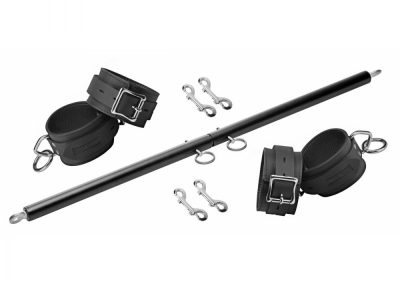 Keep them tied, tethered, and spread out with this restrictive kit. The black spreader bar is adjustable, so you can choose just how wide you want them spread. The high quality leather cuffs are adjustable as well, and connect to the bar with the included snap hooks. This will keep them bent over, their wrists tethered to their ankles and completely at your mercy. For extra security, you can add your own locks, sold separately.