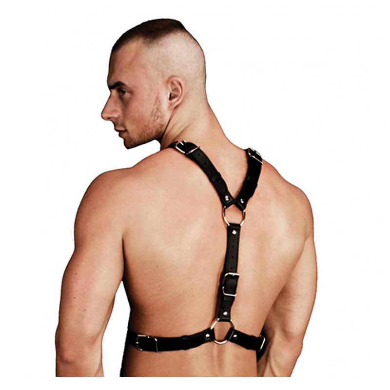 With a big O-ring in the middle of the chest area, set in strong black bonded leather and enhanced by sturdy rivets, this harness is an absolute eye-catcher! You will find another O-ring near the solar plexus, and two more on the back. The high-quality bonded leather straps are connected around the torso and over the shoulders. Adjustable buckles on each shoulder, on each side of the torso, and one on the back allow you to customize this harness to the perfect fit. Your hookups just got a whole lot hotter!